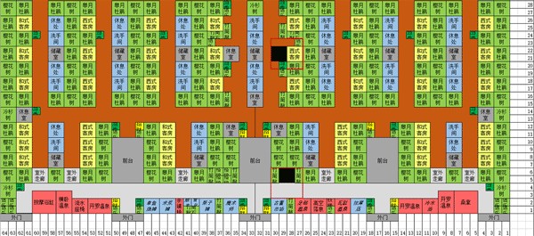 2、布局图上半部分的中间为“商业区”,每种设施仅用一个,以达成所有的契合度组合。即便没有契合度组合的设施,也置于此处。两侧是男女温泉区,所有四种温泉均有放置,而且每个温泉都具备除异性加成之外的六种温泉功效(比如男性温泉不具备花瓣之池和盐之池这两种增加女性契合度的功效)。