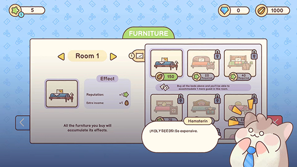 《仓鼠旅馆》中文版是一款趣味十足的经营模拟游戏。在游戏中,玩家将化身为一只可爱的小仓鼠,负责经营一家旅馆。玩家需要接待来自四面八方的小动物们,满足它们的各种需求,逐步提升店铺等级,进而解锁更多装饰品,将旅店装扮得更具吸引力,以此赚取更多的金钱。