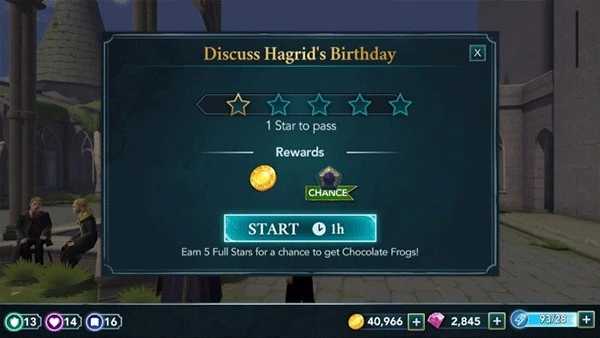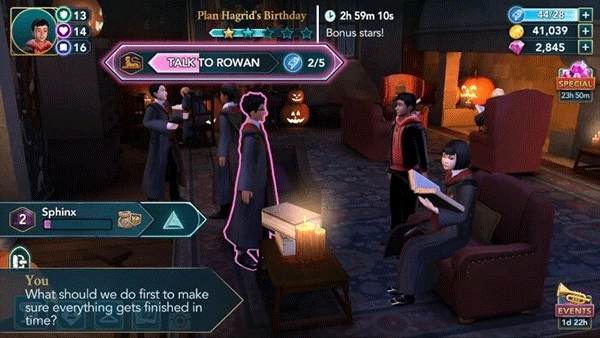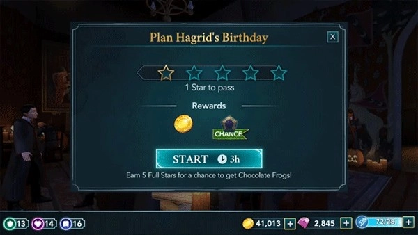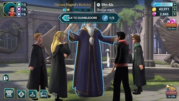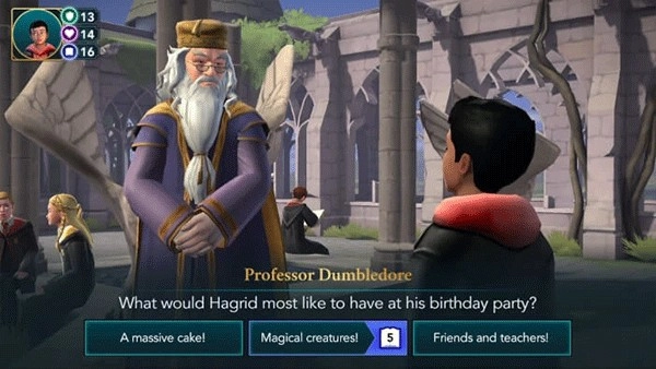 1. 本次演练会站在一名二年级学生的视角来介绍游戏。鉴于一年级及以上的学生能够参与冒险活动,所以依据你当下的主要故事进展情况,部分任务的星级以及属性要求或许会存在差异。抵达相应地点后,你就能与一些学生展开互动。点击他们头顶上方的演讲气泡,瞧瞧他们想对你说些什么。随后,邓布利多会告知你海格的生日即将来临,他期望你能帮他筹备一场惊喜派对。
