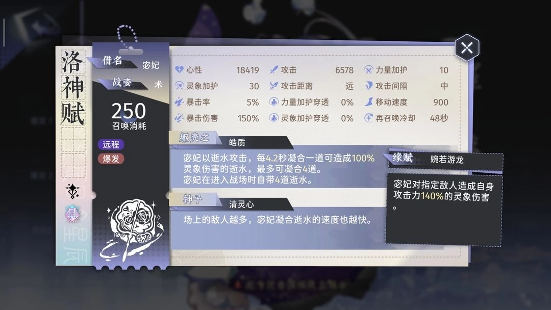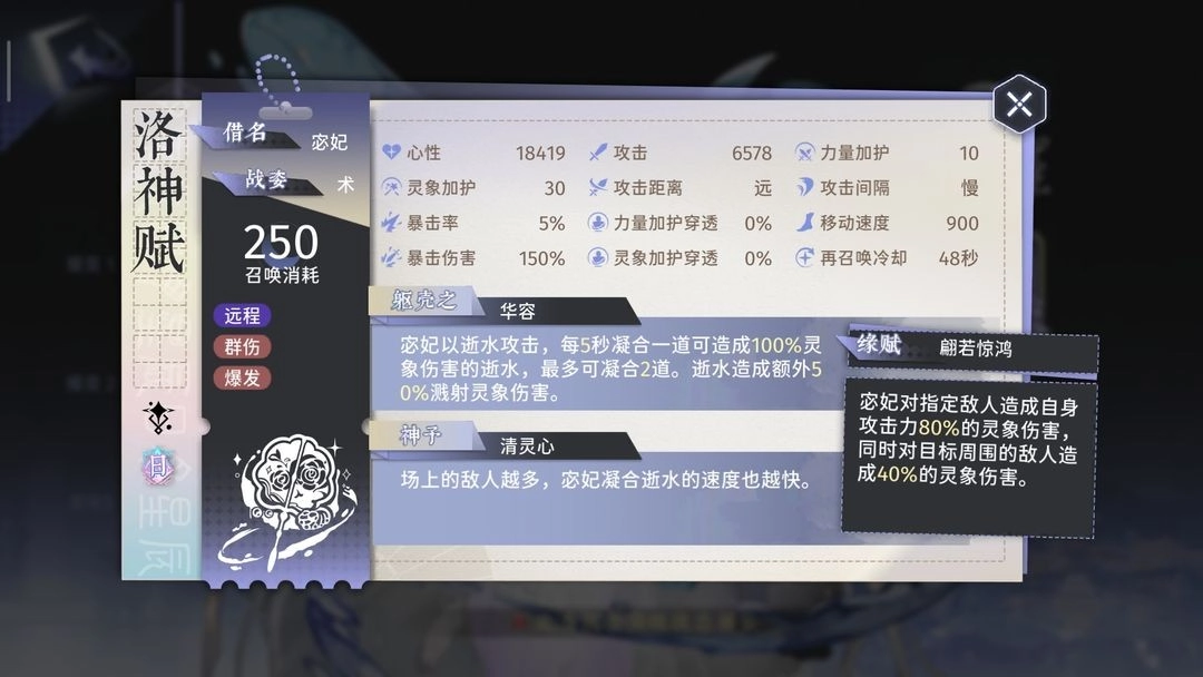 面板数值虽高,然而攻击速度实在太慢,致使角色常常处于罚站状态,往往还没来得及出手攻击,目标就已死亡,进而丢失了大量本可造成的伤害。并且在攻击残血敌人时,也会浪费许多伤害输出。再考虑到其高达250的费用,使得洛神赋在实际使用中难度颇大。蝶左增添了群攻伤害,蝶右虽说略微提升了攻击速度,可依旧是4秒多才攻击一下,速度还是偏慢。