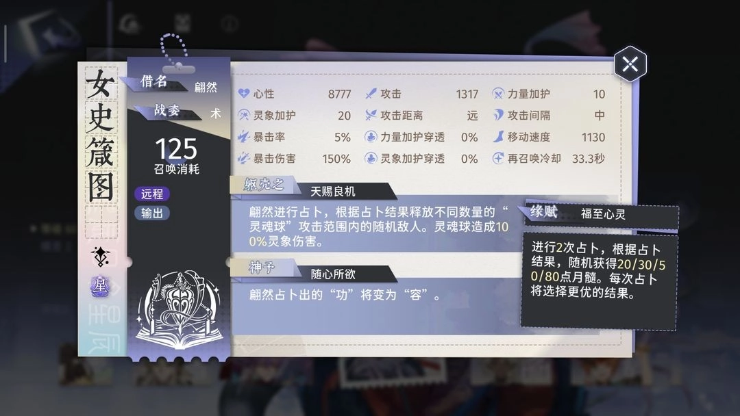 《女史箴图》,费用125,无羽化,白板攻击1098(图中显示1317是因亲密度增加了20%),攻速为5秒/次。其倍率设定颇为有趣,《女史箴图》会进行2次占卜,每次占卜结果在2、2、3、5之中,随后会选取最高值,并打出相同数量的球球用以攻击。举例而言,若最高值为5,此次普通攻击就会打出5个球球,每个球球能造成100%攻击力的伤害,即此次普攻倍率为500% 。经简单计算,每次打出球球数量的数学期望是3.5,这意味着《女史箴图》普攻的平均倍率为350% 。