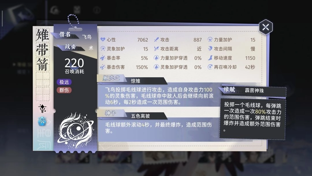 如上图所示,这是0羽化且好感度加成10%的雉带箭。若扣除好感度加成,0羽化的雉带箭攻击数值为806 ,而5羽化的雉带箭攻击数值是1008(因为羽化会有25%的加成)。其费用为198 ,群体倍率为100% 。经过测试,毛球的第一次攻击属于单体伤害(在此忽略不计),随后毛球会缓慢向前弹射,造成范围伤害。毛球弹射的过程会持续12秒,期间总共造成5次群体伤害,由此可算出攻速约为2.4秒/次。