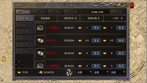 元宝拍卖:无论是上架还是竞拍的拍品,均以元宝作为交易媒介。这里面的拍品一般为价值颇高的装备及材料,勇士们能够依据自身需求选择买入。