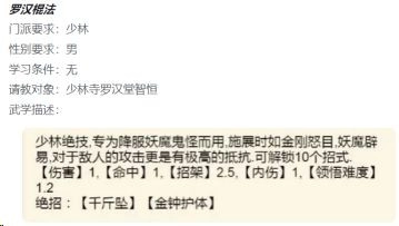 罗汉降魔功:★★(强度比易筋经高,输在贵和浪费大量潜能上,并不推荐)