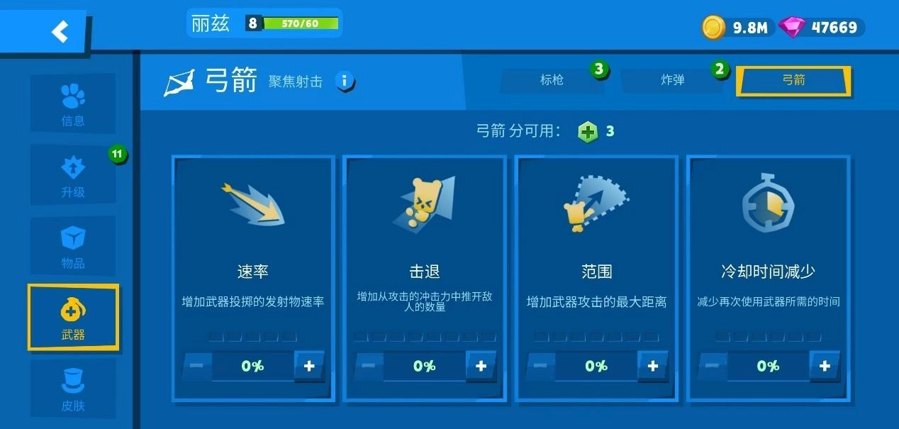 弓箭作为远程冷兵器,其加分属性与标枪一致,培养方向同样涵盖击退、范围、冷却时间减少以及速率这四个方面。