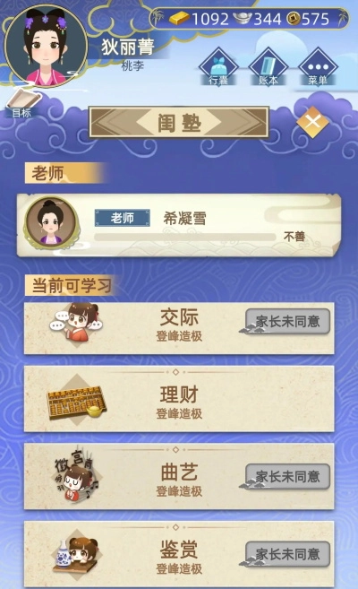 2.假如我要刷理财和女学,就一直更换老师(点击老师这一条,就能点出来),找有理财且等级很高的老师(登峰造极就更好了啦),然后只学习理财,记得点击下面的赚取收入,然后再更换老师,找女学等级高的老师,学习这一项