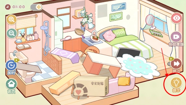 4、以搬家日记关卡为例,利用游戏所提供的道具来打理房间。