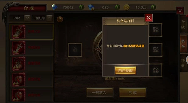 三转后开通装备合成功能,可以使用橙装、红装往高品质、高星合成