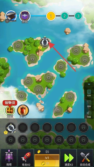 1、点击下方带标识的空位,选择【炮塔】等防御建筑,部署到岛屿,构建防御基础。