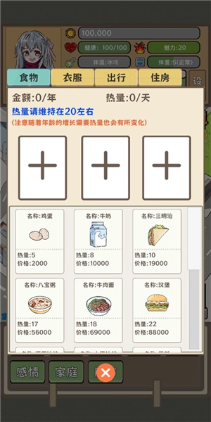 2、生活方面:在食物上,要确保每年自身精力维持在满值状态,所以一定要预留足够购买每年所需食物的资金。