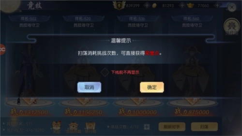 4、进行扫荡时,可直接消耗挑战次数,并能直接获取荣誉奖励(可勾选“本日不再提示”)。