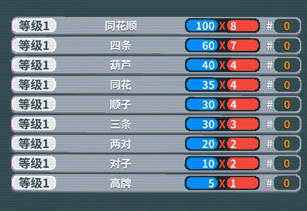在游戏对局里,玩家打出牌后,依据出牌所符合的牌型来计算分数。蓝色代表基础筹码值,红色代表基础倍率。下面的图表展示了各类牌型的初始计分数值。玩家能够使用星球牌对下述牌型进行升级,升级之后,基础筹码值与基础倍率都会提高。
