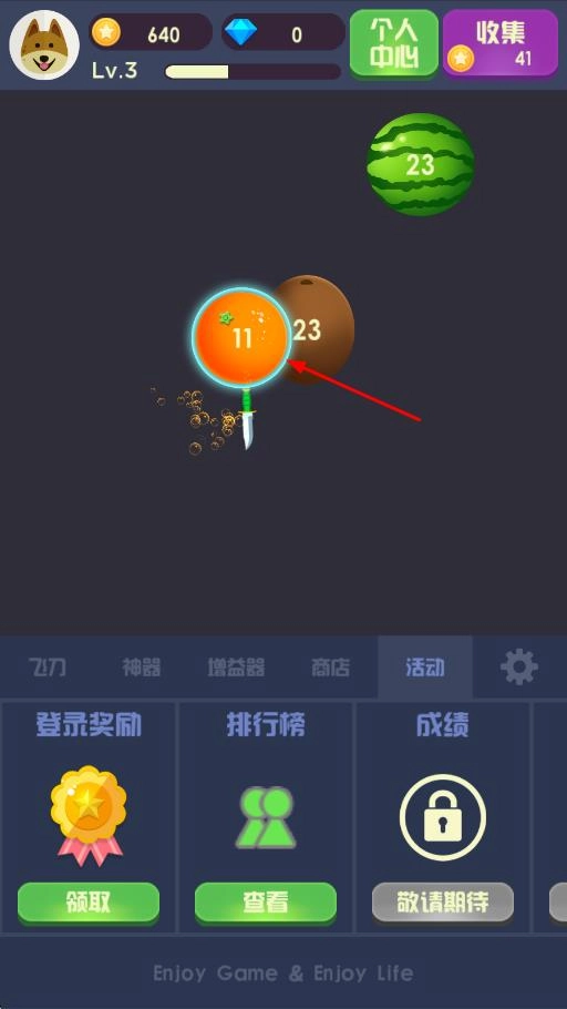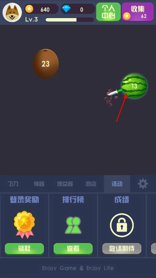 2、道具助力,趣味闯关:游戏中设有慢动作、分身飞刀、护盾等实用道具。玩家可通过积累分数或完成任务来获取这些道具。在闯关遇到高难度波次的关键时刻,使用道具能让玩家轻松应对,有效提升闯关的容错率。