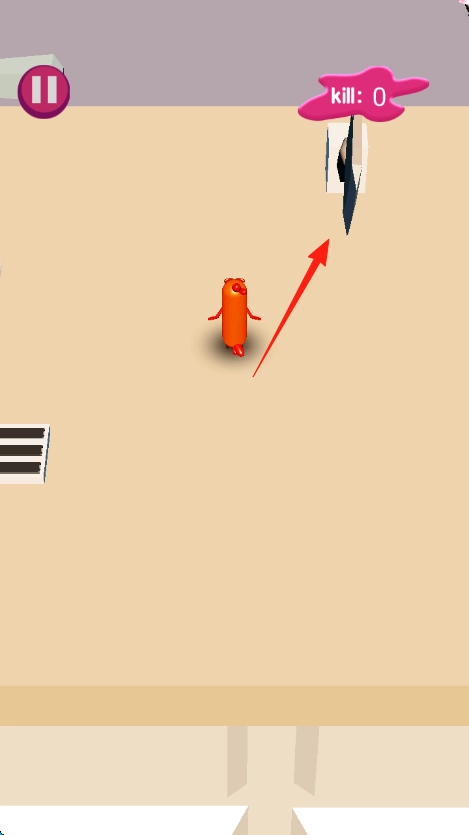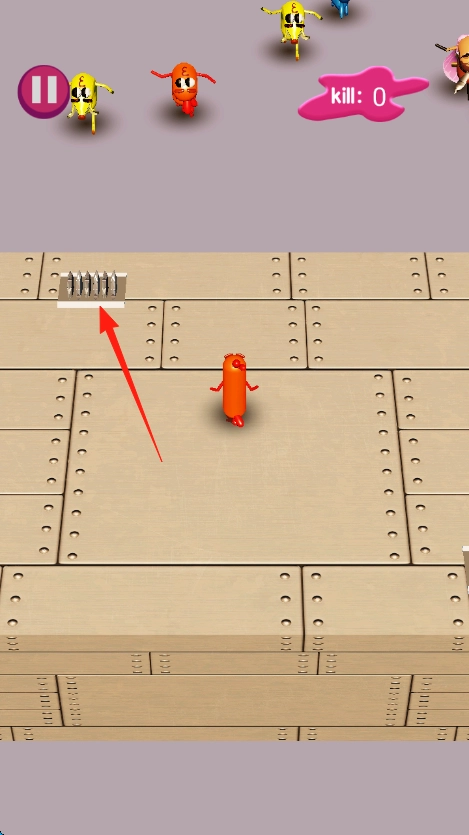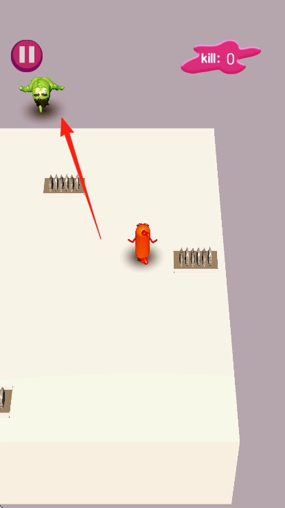 1. 操控橙色香肠,避开箭头所指的尖刺陷阱,可以选择绕路或者跳跃。同时,要躲开黄色敌人,朝着安全区奔跑。在此过程中,不断积累kill数,从而推进关卡。