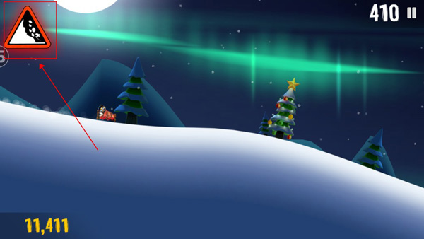 屏幕左侧上方的雪崩警示牌会在雪堆即将接近时不断地闪烁以示警告,即时你已经在视野中能够看到背后奔腾而来的大雪,如果此时爬起继续滑行,那么甩掉这近在咫尺的雪堆也并非不可能。