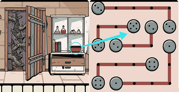 6、输入符号密码,打开正大门右侧的柜子,接着点击右下方的红色盒子,完成上面的机关(连连看),就能拿到里面的白色宝石。