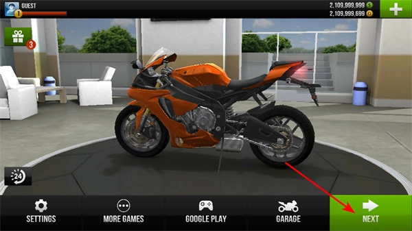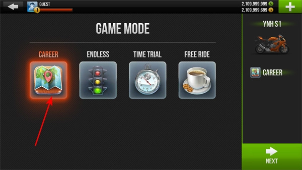 1. 点击“NEXT”按钮,进入游戏模式选择界面,开启摩托车驾驶游戏的基本流程。