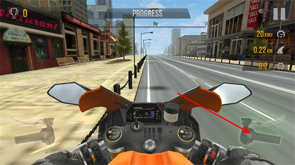 4、持续操控油门,让摩托车在城市道路场景里平稳行驶,达成关卡所设定的行驶距离任务。
