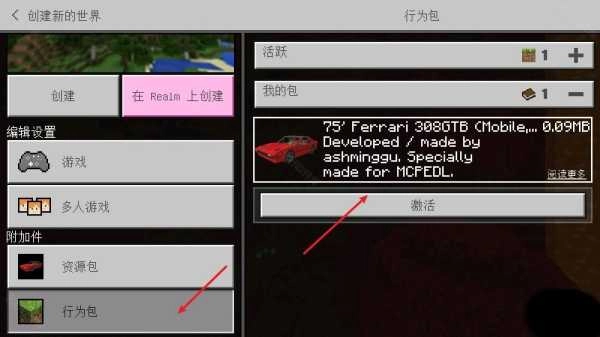 2、在创建世界的设置页面,点击左下角的“附加件”,依次进入“资源包”和“行为包”,从“我的包”中找到已导入的“法拉利跑车”相关组件,并将其全部启用。若未生效,请返回重新执行创建流程。
