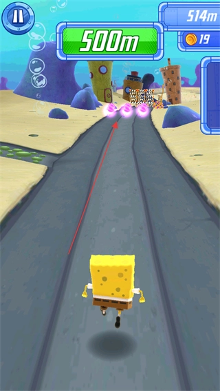 1. 游戏启动,操控海绵宝宝朝着前方奔跑,注意屏幕上方所显示的奔跑距离,例如144m 。