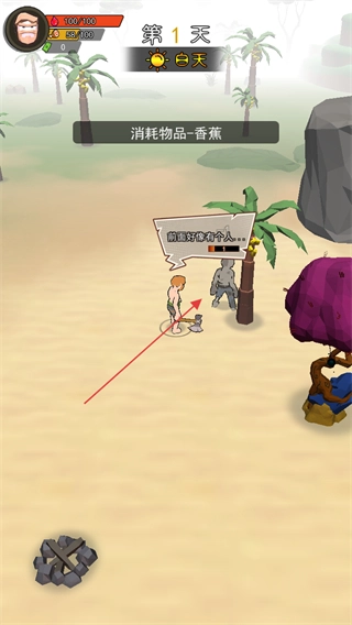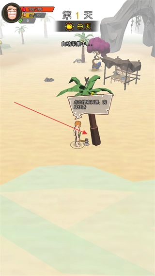 1. 游戏开始于第1天的白天,点击棕榈树,依照提示点击挂机,即可自动砍树,从而收集资源、获取物资。