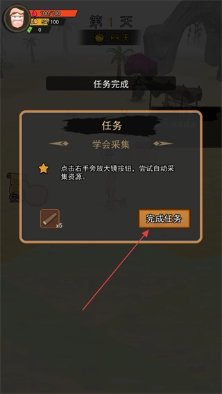 4、当完成任务之后,点击“完成任务”按钮,即可领取奖励,比如获得木棍,从而推进游戏进程。
