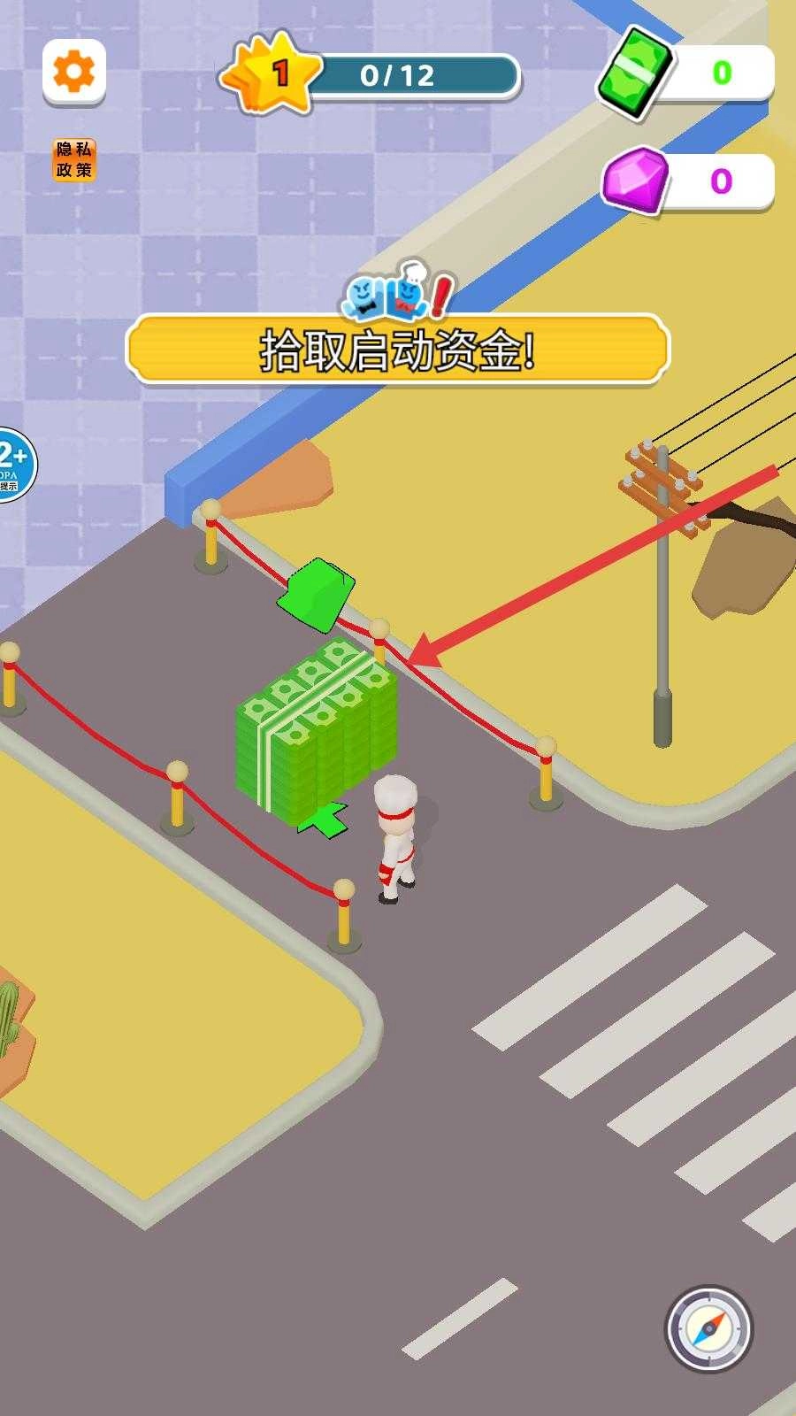 1、开启游戏后,第一步需拾取启动资金,依照指引向绿色资金堆靠近,从而获取用于开启经营的初始费用。