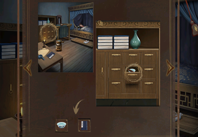 点击场景中药柜的中间抽屉将其拉开,然后拾取火折子和空碗这两个道具。