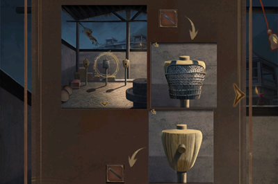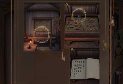 点击场景里的木桌桌面,就能拾取“百草录”这个道具。通过它可以查看每种药材对应的形状,其中被红圈圈出的就是所需的药材。