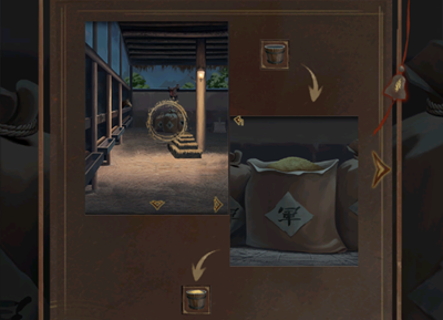 来到军营之后,前往左下角的场景,在该场景门口的桌子上,拾取火折子这一道具,随后用火折子将油灯点燃。