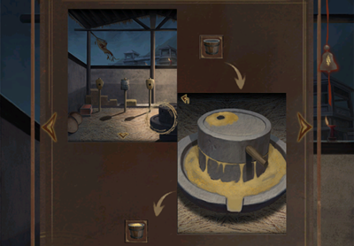 从箱子里取出铜压杆和木制轮毂这两件道具,接着前往压水台,把铜压杆安装妥当。随后将空木桶放到压水台的正下方,点击压杆压出水流,直至木桶被装满水。