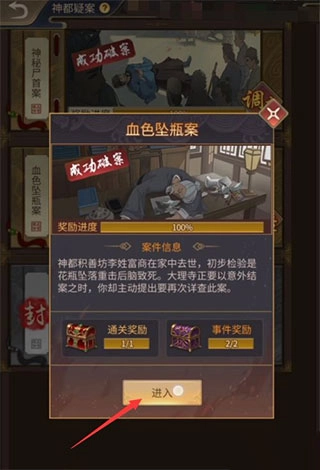 打开游戏,如图所示点击【进入】第二关血色坠瓶案。