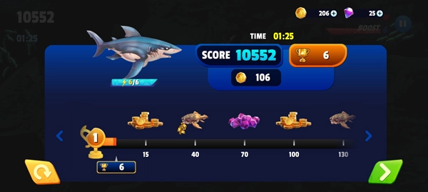 5、通过新手教程后就可以开始玩了。 玩家可以控制鲨鱼吞食小鱼。 当下方能量条满时,他们还可以获得加速,获得更多积分;