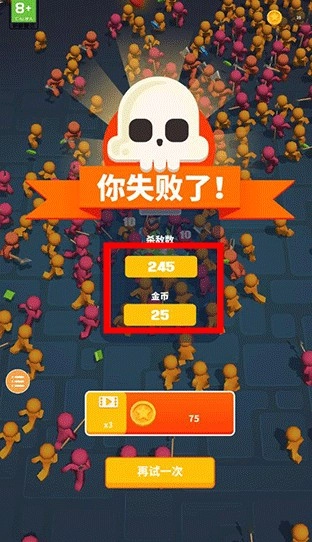 一旦生命值耗尽,游戏就会结束并判定失败,同时统计你的击杀数量和收集到的金币奖励进行结算。