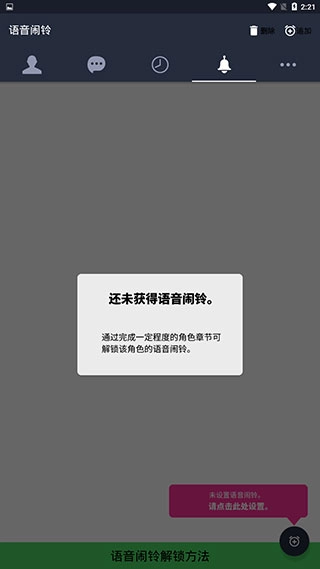 在语音闹铃界面能够设置对应角色的语音闹铃,这类语音闹铃需通过完成角色章节来解锁。