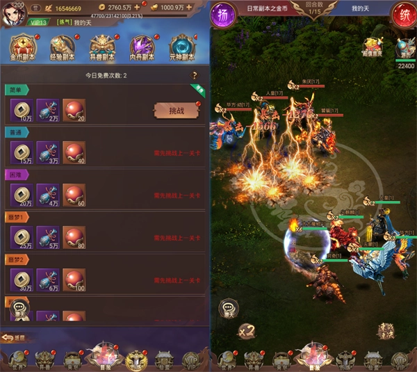 日常副本是游戏里获取材料的关键渠道,也是玩家每日必做的任务。副本共有五种类型,分别是金币、经验、异兽、内丹和元神副本,玩家需要通关上一难度的副本才能解锁下一难度的副本,难度等级从简单到地狱依次递增。挑战不同类型的副本,能够获得对应的各类材料资源奖励。
