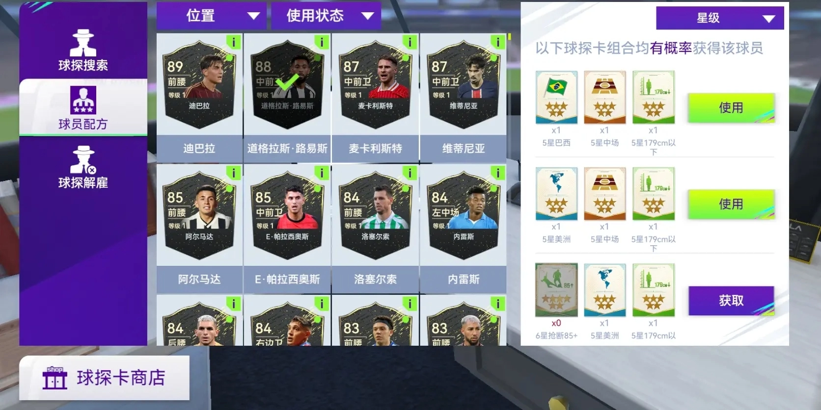 主帅能够从自己的球探库中挑选三张不同类型的球探卡来搜索球员。不过我更建议各位主帅进入球员配方界面,根据自己想要的配方去搜索球员。