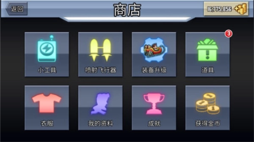 在商场里,你还能找到小工具、喷射飞行器、装备升级、道具、衣服等相关选项,根据自己的喜好进行购买和升级,让你的飞行体验更加顺畅。