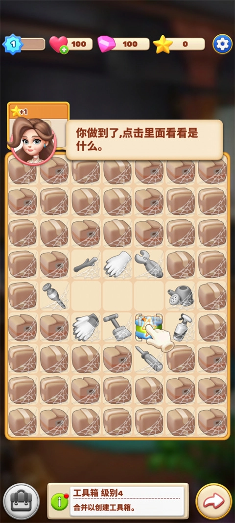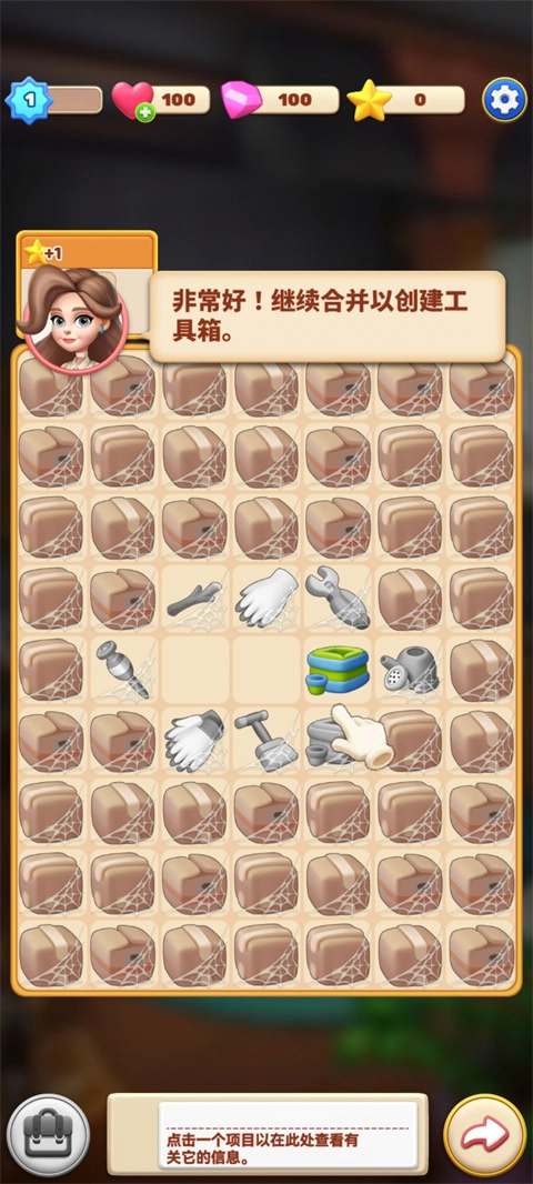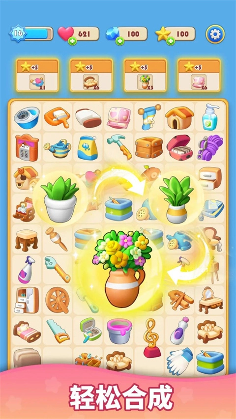 简易上手指南:把拼图板上的两个相同元素进行合并,从而制作出新的道具与工具,以此来翻新客厅、卧室、厨房、花园以及温室等各类房间。