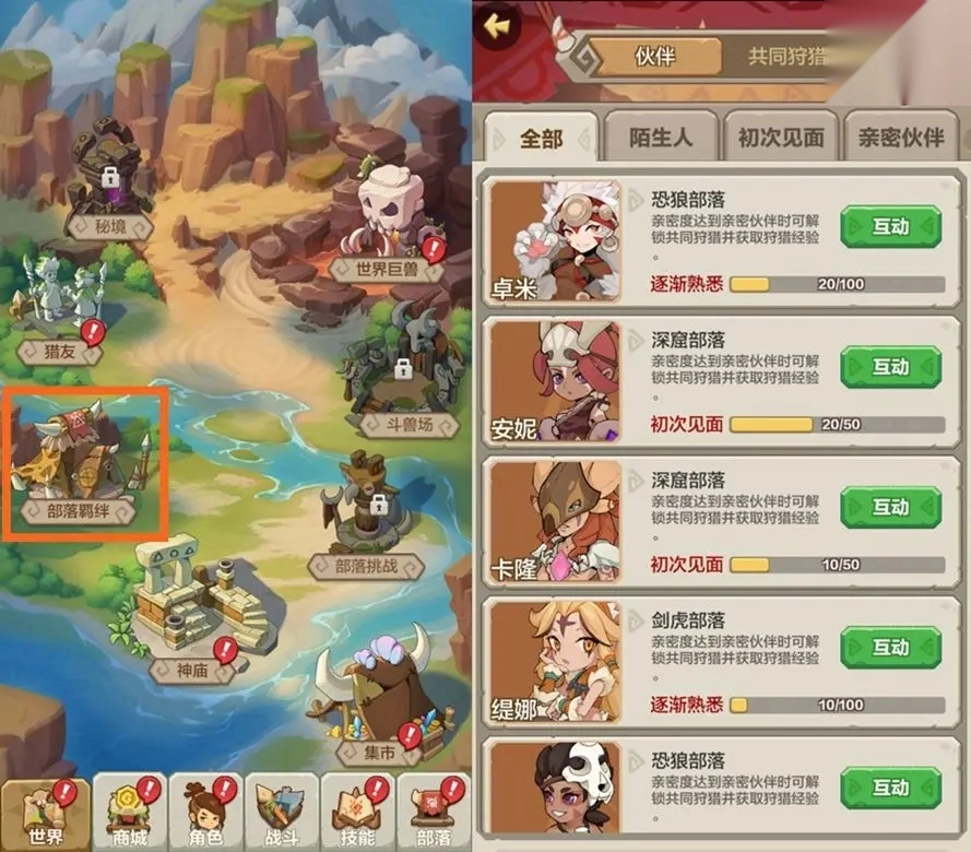 每个部落通常设有5名NPC:首领负责技能学习,大祭司掌管职位晋升(与技能学习相关联),战士长主管部落集市,其余两位战士则是可结交的伙伴。需要注意的是,加入部落后即可通过赠送礼物提升与他们的好感度,即便后续退出部落,好感度状态也会保留,只是需要从“世界-部落羁绊”界面找到他们,才能继续互动操作。