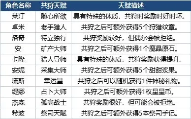 接下来就到了和伙伴们一起共狩的重要环节啦。与伙伴共狩不仅能获取狩猎经验,还可能得到一些特殊道具呢——比如狩猎纹章、魔晶原石、甜甜浆果,甚至还有星星币。小编已经把前五个部落伙伴的共狩天赋整理出来了,还没和他们建立羁绊的小伙伴可要抓紧行动啦!