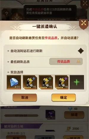 使用2000积分可派遣主线任务,建议优先挑选能产出钻石或红色英雄碎片的主线任务,您能够通过放置奖励来获取派遣点数。