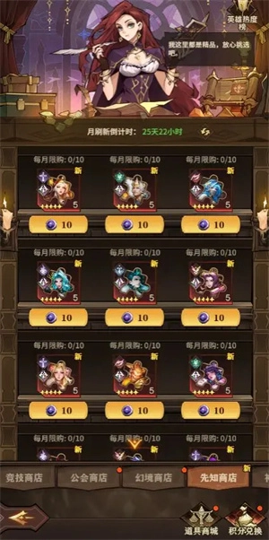 购买各类资源的场所。请不要在此随意消耗钻石。务必定期查看积分兑换板块,特别是先知商店里的神魔角色(需依据角色等级列表进行挑选)。