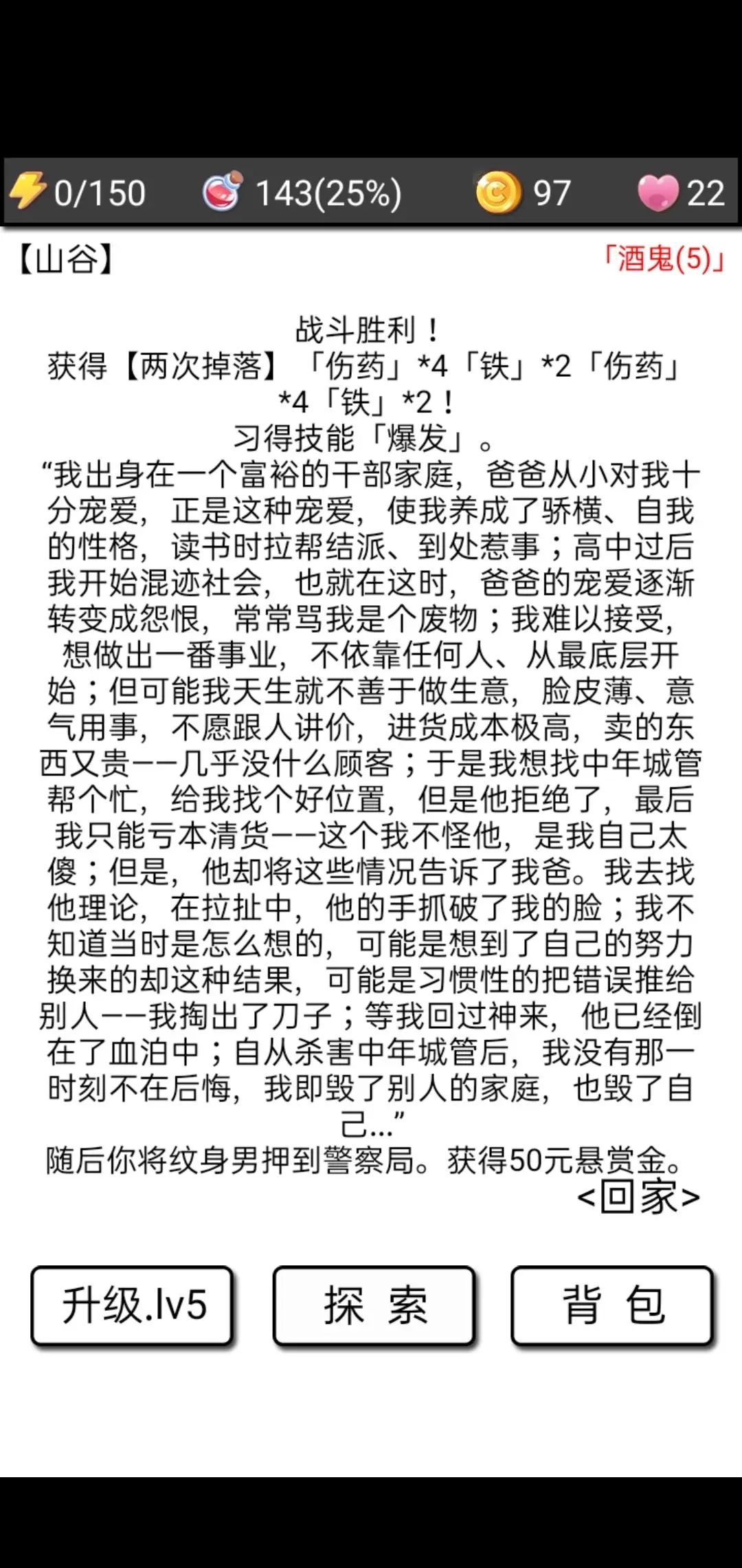 第四件事是有个大汉会找你要2块钱(你可以选择打他,大汉有概率掉落铁块,战斗时他还会摔跤掉出草药;要是你多次给他钱,他会带你找到一只超厉害的神秘巨兽,那家伙有1000多血——你要是能打得过纹身男,说不定也能打得过这只巨兽)。我等下会放出山谷里的怪物,肥料能强化地图里的怪物,但探索能拿到的奖励也不少。