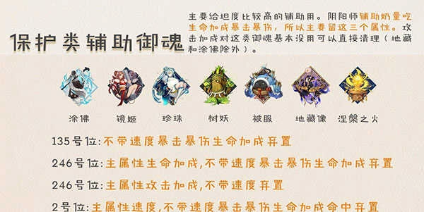 辅助类御魂的核心在于功效,而非御魂本身的加成属性,因此整理时要依据功效来分类。这类御魂通常适配坦度较高的辅助式神。阴阳师里辅助的奶量与生命加成、暴击、暴伤相关,所以这三个属性的御魂要重点保留。攻击加成对这类御魂基本无用,可直接清理,但地藏和涂佛是例外,需在整理完其他后再单独恢复。