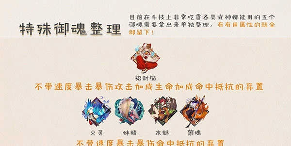 目前在斗技场里特别受欢迎、几乎所有式神都能用的五套御魂!不过它们的获取难度都不小,所以得单独整理出来,只要带有有用属性的都得留着!特别是招财猫,下面会把值得保留的属性逐一列出来。