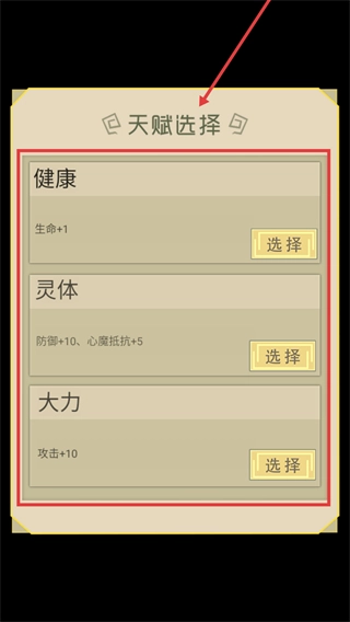 进入游戏后选择天赋时,建议优先考虑【灵体】——它能提升防御能力与心魔抵抗效果,或是【大力】——可增强攻击属性,具体选择可根据个人的玩法偏好来决定发展方向。