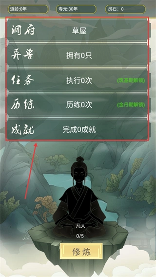 在主界面可以查看【道龄】【寿元】【灵石】这几项信息,建议先点击【修炼】提升修为,之后就能解锁【任务】【历练】等其他功能了。