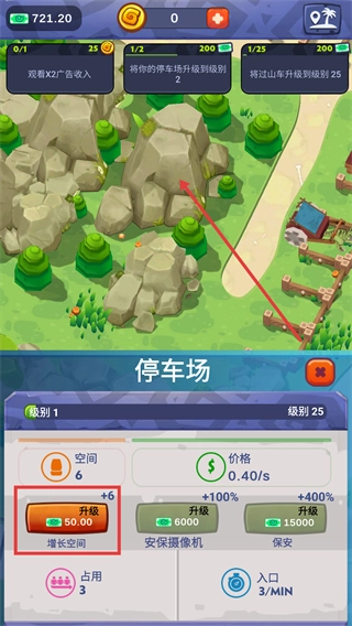 点击红色框内停车场的【升级 增长空间(50.00)】按钮,以提升停车场的空间属性。