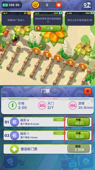 进入门票界面后,找到红色框标注的门票,依次点击其对应的【升级】按钮,这样就能提升门票等级,同时提高收益效率。
